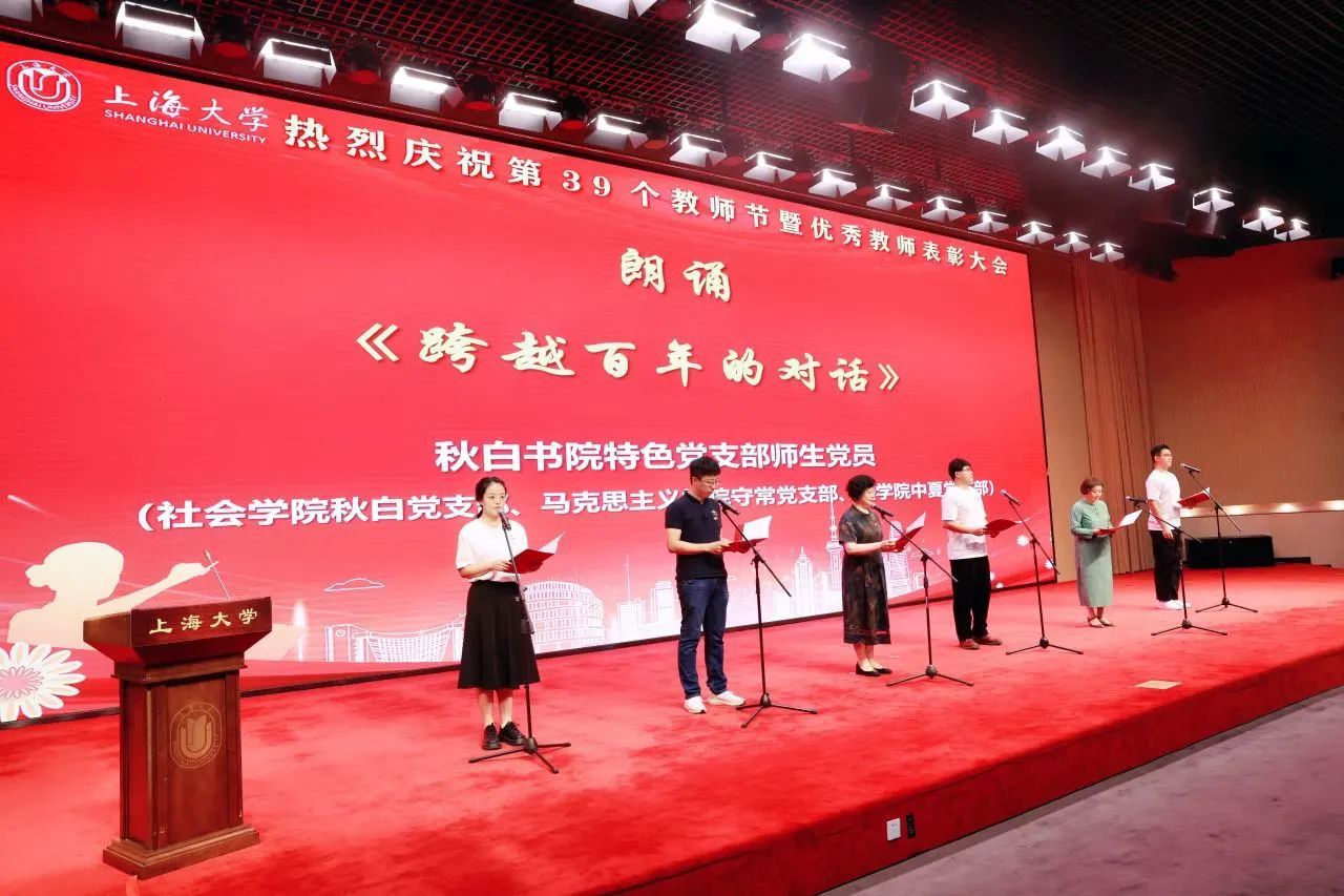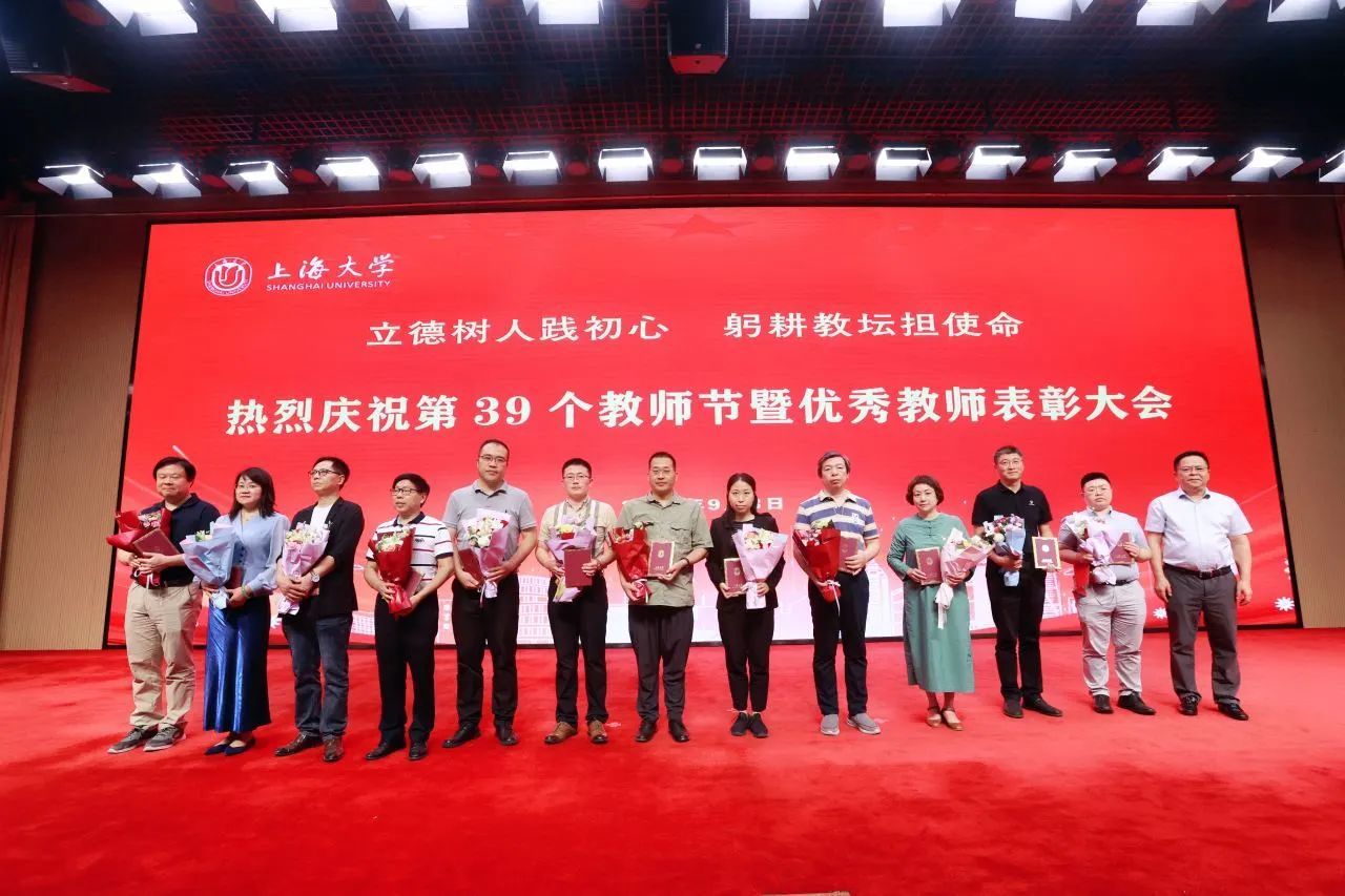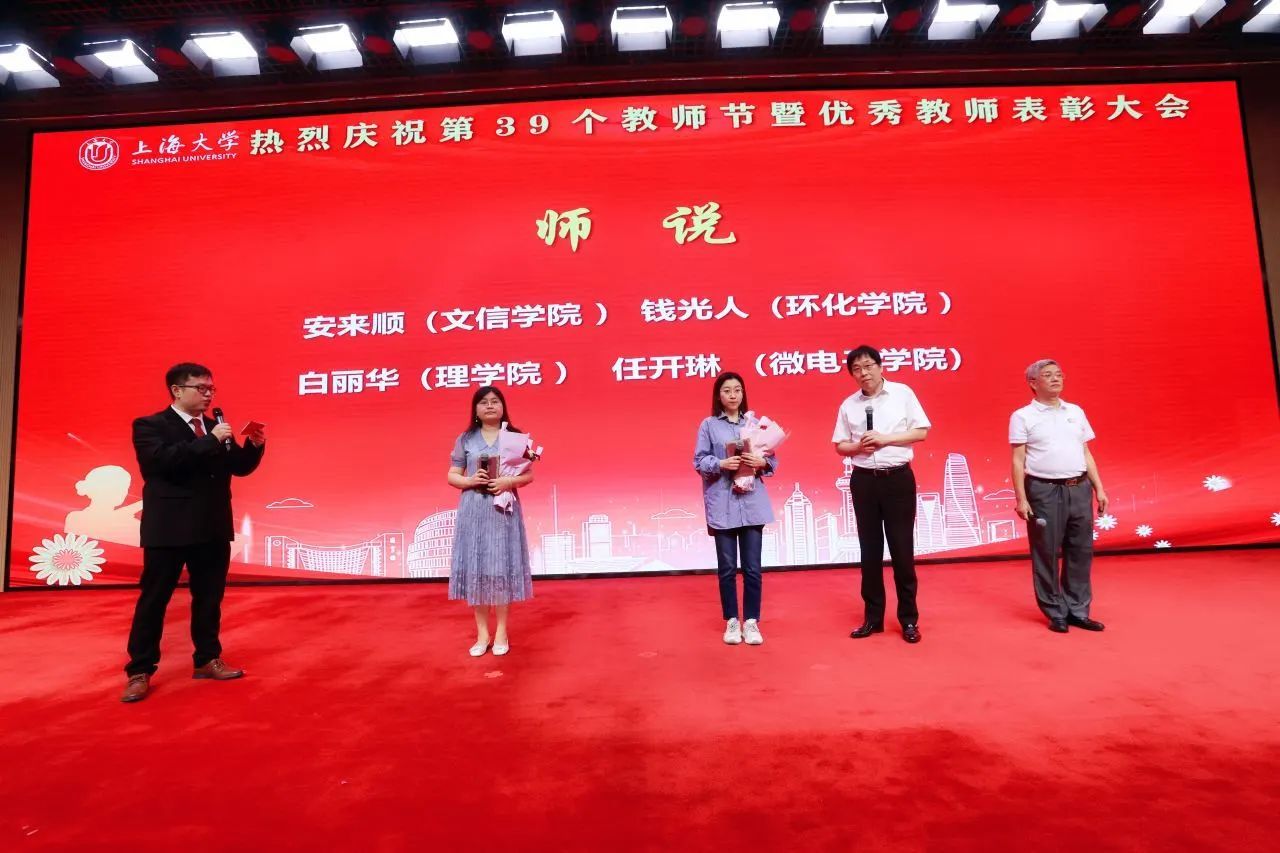 新进教师代表为从教三十年教师代表献花,学习他们矢志不渝为教育事业殚精竭虑的品格。从教三十年教师代表为新进教师代表赠送校徽,鼓励他们传承上大自强不息的精神,爱岗敬业、潜心育人。