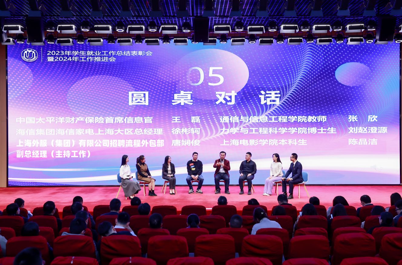 中国建筑第八工程局有限公司人力资源部副总经理于洋作为企业代表围绕校企深度合作新路径作交流发言。在圆桌对话环节,97届校友、中国太平洋财产保险股份有限公司首席信息官王磊,海信集团海信家电上海大区总经理徐彬轲,上海外服(集团)有限公司招聘流程外包部副总经理(主持工作)唐娴俊,通信与信息工程学院辅导员张欣,力学与工程科学学院2023级博士生刘赵澄源和上海电影学院2024届本科毕业生陈品洁从校友、企业、教师、学生的角度,分别围绕校友助力学生就业、产业转型对人才的需求变化、校企人才供需匹配、生涯发展与就业指导等主题分享了观点。