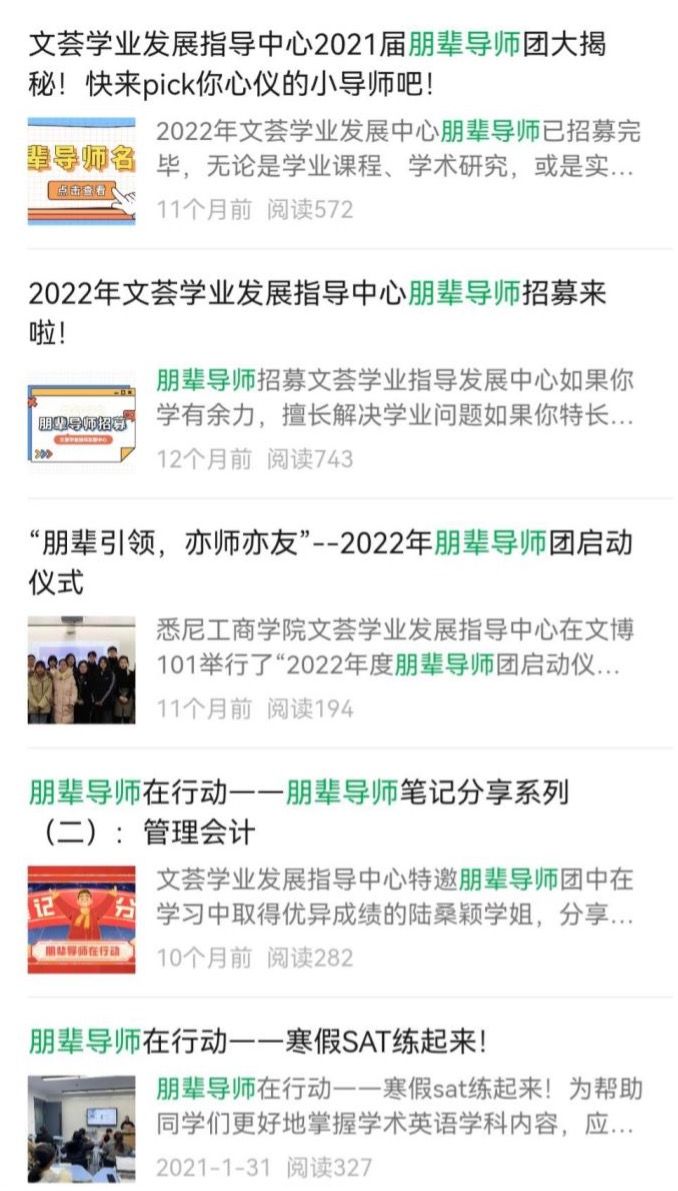 根据不同的导师类型,各位朋辈导师需要完成不同的既定工作内容,主要包括:录课、笔记分享、课程辅导或答疑、朋辈讲座或朋辈故事会……当然,我们也十分鼓励朋辈导师们充分利用个人特长和优势,创新朋辈引领形式,开拓新的朋辈互动引领栏目,为悉商学子带来更丰富的学业帮助。